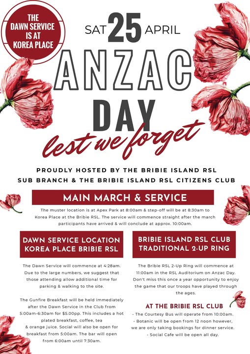 Bribie Island will host its main ANZAC Day commemorations at Korea Place, beginning with a dawn service followed by a morning march and main service.